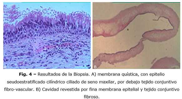 El mucocele del seno maxilar está limitado por una cápsula de epitelio conectiva, que se constituye por mucosa respiratoria normal, con un epitelio seudoestratificado cilíndrico ciliado, y el corion subyacente presenta fibrosis e inflamación crónica, donde es inusual encontrar epitelio escamoso metaplásico, siendo la mucosa respiratoria ciliada el revestimiento más frecuente, en cuando a la histología del proceso se refiere a que el contenido se forma por exudado inflamatorio mucoide con células de decamación y abundantes polinucleares, pudiéndose hallar cristales de colesterina, macroscópicamente tiene el aspecto de líquido mucoso, de consistencia gelatinosa, ocasionalmente también puede tener aspecto purulento.(4,5,6,7)